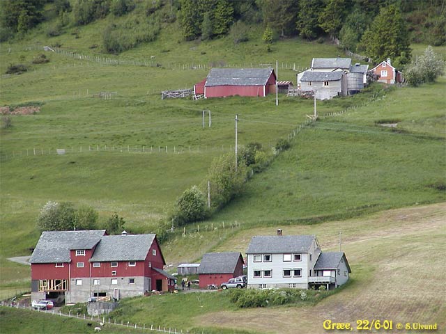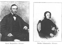 26, 1819 - May 5, 1895) (Britha's father, Johannes Himle, was both a canny farmer and one of the area's most accomplished blacksmiths, being especially well known for crafting the clasps on clothing chests and locks. Her father, Amund, was first a hired hand on a small farm called "Moatraa" below Mo in Granvin. He was a tambur (drummer?), and was in the the 1809–1814 war, during which he was promoted to battalion tambur. For a time he owned the Lae farm in Tykkebygden, Voss, and then bought the Himle farm, where he lived until his death. Amund was widely known for witticisms, of which he had a never-failing supply. The reason he got away from Moatraa was that his home burned to the ground one night, and he was only just able to save his wife and children. All of his possessions went up in flames, and he had no insurance. Later he said himself that the fire proved to be a great blessing, because thereby he escaped his lowly job.) Knud R. Glimme came home from the military on December 31, 1852, after ten years of service. He was a longtime member of the school board, and chairman of the equality board in the early '60's, just when the new equality laws were beginning to be enforced in Voss, and he was also the first librarian of Voss' public library. He was an insightful and intelligent man, with good spiritual and physical strength, but his work was usually somewhat haphazard. Confronted with beginning a large task, he would think it over and delay starting for as long as possible. But once the job was begun, Knud worked with no holds barred. At the age of eighteen he was struck by lightning, and he bore the consequences of this for the rest of his life. After the bolt hit him, quite a while passed before signs of life showed in him again. His whole nervous system was badly shaken. After that day he was always able to foretell when thunder or lightning were approaching. Usually he would go to bed then, or keep absolutely still in the living room. He could not bear to be at home when it was time to slaughter livestock, but always took care to be away from the farm. He was usually rather melancholy and silent, read a great deal, and easily grasped shadowy philosophical problems. He greatest pleasure lay in writing and tinkering with his books. He wrote well, and expressed himself in a clear, nice, and correct manner. His wife was of a decidedly different nature. She was not very big, fine-boned, and with a good figure, but she was unusually strong and energetic. She was on the go from morning til night, carrying heavy bales of hay around as well as the strongest workers did, and helping wherever needed. She was the soul of the place. She spun, wove, pressed, dyed, and sewed all the children's clothes, and made and sold women's hoods. She was the first person up in the morning and the last to bed at night; she did not seem to need rest. Four o'clock was her customary rising time, and she would go about humming small songs in her contentment with the world. Her sparkling good humor was contagious to the other members of her household. She was on the best of terms with all her neighbors. Many people sought her advice, which she gave willingly, but never offered without being asked. Her children regarded her with great love, esteem, and respect, and knowing her has marked their spiritual lives. Nine children. |