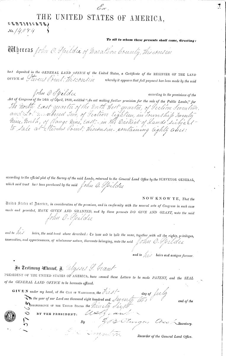Lists 80 acres being purchased by a John O Spilder on 07/01/1872.